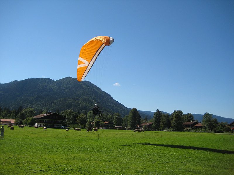 Die nächsten Flugberge sind von Holzkirchen in ca. einer halben Stunde erreichbar. Wir finden ideale Bedingungen vor: Je nach Windrichtung und -stärke suchen wir das beste Fluggelände aus. Nach der ausführlichen Landeplatzeinweisung fahren wir mit der Bahn noch oben (auf Wunsch der Teilnehmer sind auch Aufstiege zu Fuß möglich.) Nach einer genauen Gelände- und Wettererklärung stehen wir am Vormittag am Startplatz. Die erste Thermik setzt ein. Der bayr. Himmel ist weiss blau.